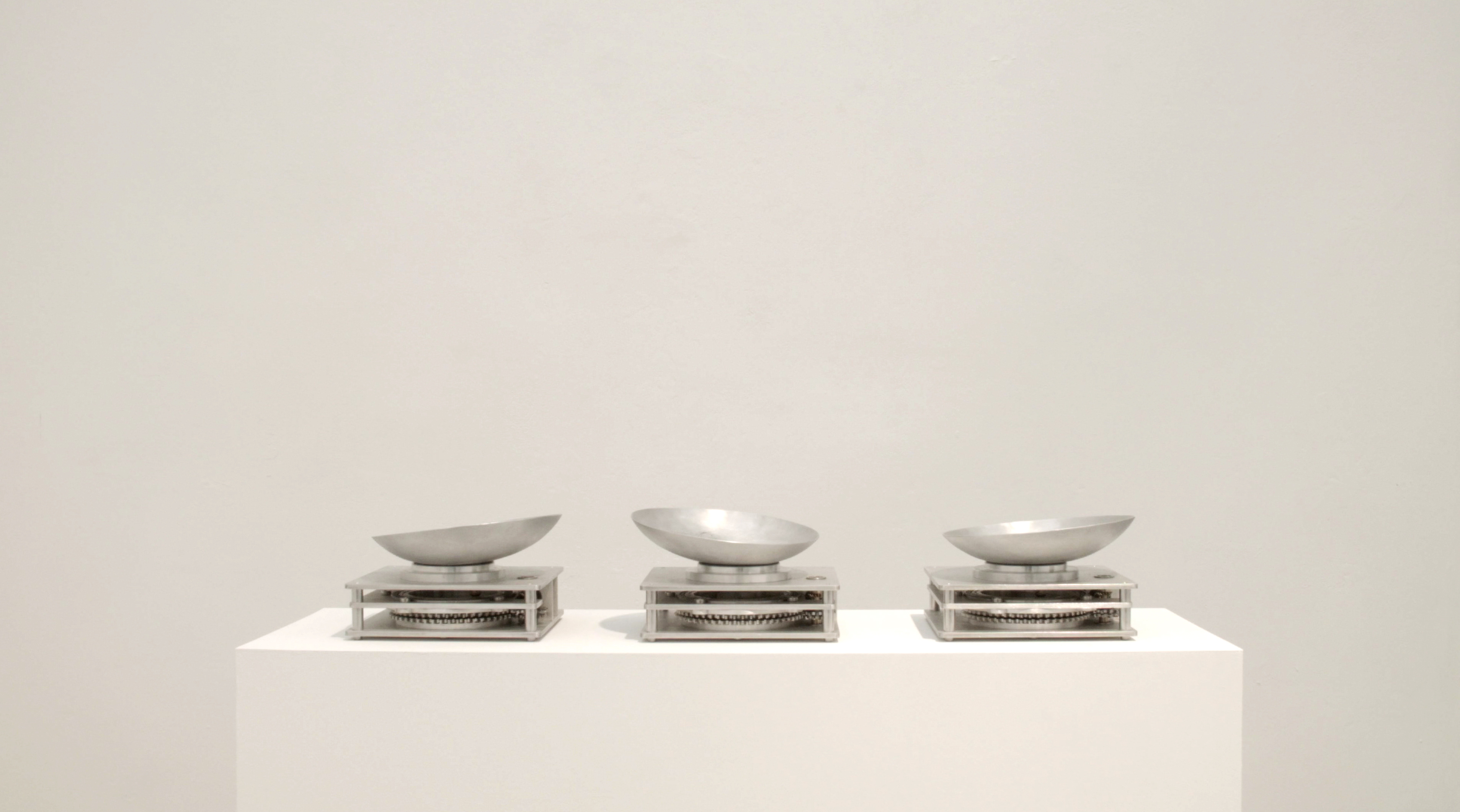 A series of mechanical sculptures circulate bowls filled with a cooling liquid in a spiral path. The bowls contain engraved sketches, notes, maps, or biographical markers. The oscillating motion of the bowls causes the engravings to sink below the surface of the liquid and disappear or rise again, forming temporary compositions of memories.